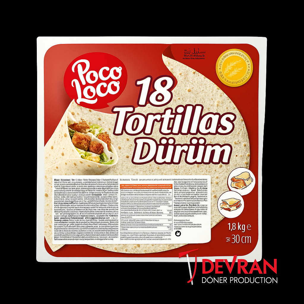 PocoLoco Dürüm is een zachte, extra grote wrap van 30 cm. Perfect voor het vullen met döner, kip of groenten. Stevig, flexibel en ideaal voor horeca. Halal geschikt en per grootverpakking leverbaar. Neem contact met ons op om te bestellen.